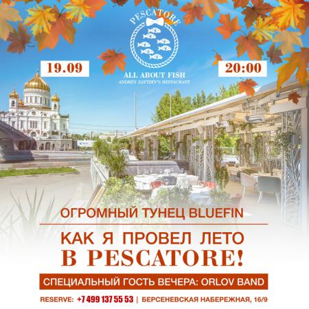 Ресторан морской кухни Pescatore 19 сентября празднует свой день рождения. По традиции вечеринка пройдет на открытой веранде, которая по своей форме напоминает фешенебельную яхту. Вас поразит необычайной красоты вид на Москва-реку и Храм Христа Спасителя. Специально для гостей ресторана Pescatore живая музыка и популярные хиты от кавер-группы Orlov Band. Вишенкой на торте этого вечера станет огромный тунец, специально привезенный из Японии и весом больше 50 килограмм. Которого разделают прямо под открытым небом. Именитый шеф-повар ресторана Мидо Мустафа покажет вам настоящее гастрономическое шоу.