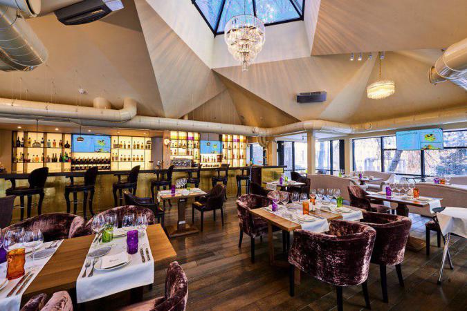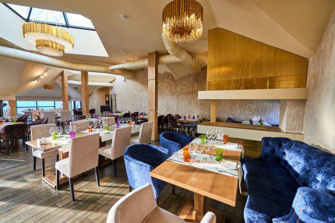 Двухэтажный ресторан со стеклянным потолком оформлен в современном стиле. Уютные, мягкие диваны и кресла для желающих провести семейный вечер или встречу с друзьями, в сочетании с барной стойкой с высокими стульями для любителей уединиться у бара. Также в наличии VIP- зона и большой экран. Аквариум с устрицами - визитная карточка основного помещения! На 5-метровом мега-мангале готовят многие мясные, рыбные блюда и изысканные морепродукты. Вегетарианцев обрадуют различные блюда и spa-салаты. Профессиональный сомелье подберет вино, необходимое Вашему блюду!