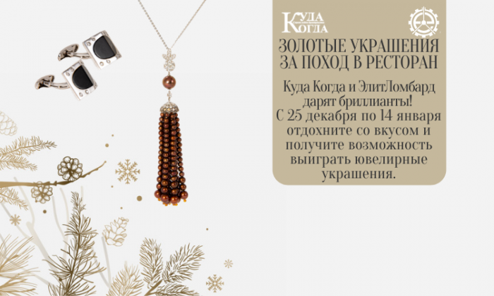 С 25 декабря по 14 января каждый клиент Куда Когда получает шанс выиграть бриллиантовую подвеску или запонки! Бриллиантовые украшения из белого золота 585 пробы, подвеска с натуральным темным жемчугом, запонки с черным природным кварцем. Качество подтверждено партнерами акции – ЭлитЛомбард. К подарку прилагаются документы оценки Геммологического Центра МГУ (у нас все серьезно).