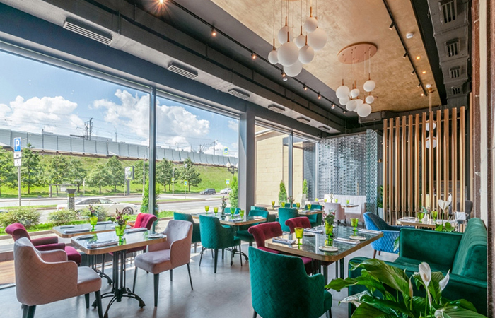 Очень светлый и стильный ресторан с панорамным видом расположился в Хамовниках на набережной Москвы-реки. В интерьере чувствуется дизайнерский вкус – смелое сочетание чистого белого цвета и ярких акцентов, зеркальных поверхностей, огромного разнообразия форм и текстур редко выглядит настолько органично, не перегружая пространство, а напротив, даря ему ощущение свободы. Во многом этому способствуют и панорамные окна, из которых видны самые красивые закаты сквозь кроны деревьев. В целом, место довольно универсальное, но особенно хорошо здесь будет провести свидание.