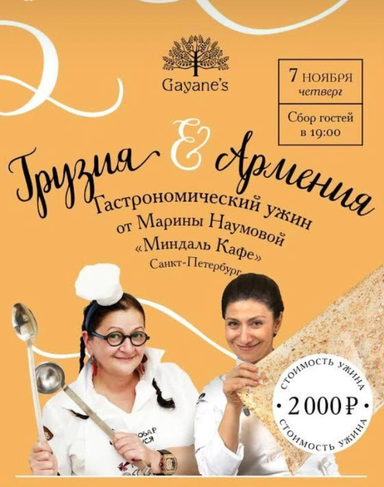 Хотите приобщиться к грузинской кухне и провести вечер с пользой, тогда отправляйтесь в армянский ресторан Gayane's. В котором состоится незабываемый гастрономический ужин. 3 ноября в 19.00 специальный гость мероприятия Марна Наумова известный шеф-повар Санкт-Петербурга (Mindal Cafe) покажет мастер-класс по блюдам грузинской кухни. Ну, а гости заведения смогут оценить их вкус и превосходную подачу. В программе вечера особое меню: сет пхали и хачапури; томаты с соусом из тархуна и джонджоли; сациви из сочной курицы с национальной кукурузной кашей - мамалыга; фирменный хинкали от Маруси; Абхазура, котлета из рубленного мяса с семенами граната; мороженное, приготовленное из халвы с пахлавой, чипсы из грецкого ореха и гранатовый сорбет. Ресторан Гаянес заведение с красивым восточным интерьером и вкусной едой. Лучший кавказский ресторан в Москве. Цена билета на ужин всего 2000р, забронировать столик вы можете бесплатно по телефону: +7495 137 5553 или онлайн.