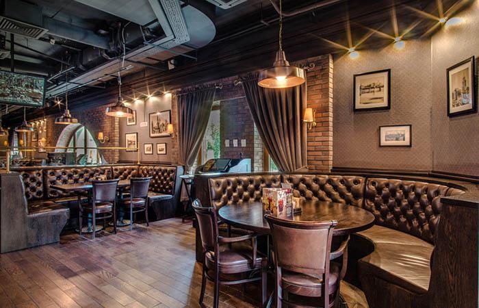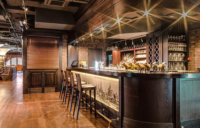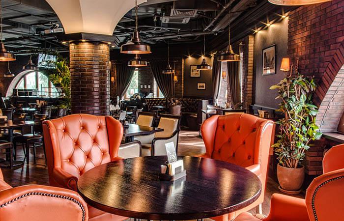 Интерьер в глубоких кофейных тонах сочетает в себе брутальность кирпича и мягкий рассеянный свет с роскошью натуральной кожи. Вдоль стен выстроились шкафы с вином, а в одной из стен расположилась камера вызревания, попутно выступающая в качестве витрины. Благодаря ей мясо для ваших стейков становится особенно нежным и приобретает ни с чем не сравнимый насыщенный вкус.